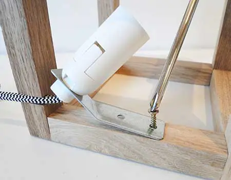Befestigen Sie den Winkel am Kabel Ihrer DIY Beleuchtung. Dieser sollte sich direkt unter der E14-Fassung befinden. Führen Sie nun die Fassung in den DIY Würfel ein. Schrauben Sie mit den zwei Schrauben den Winkel an einer der Leisten fest, um so das Kabel zu fixieren. Damit der Würfel gerade stehen kann, können Sie in eine der Boden-Leisten einen Schlitz zur Kabeldurchführung machen.