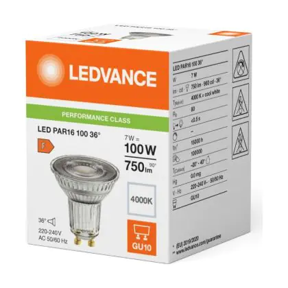 Die Ledvance LED PAR16 GU10 Reflektor 7W 750lm 36D - 840 Kaltweiß | Ersatz Für 80W ist eine effiziente GU10 LED-Lampe und der perfekte Ersatz für Ihre konventionelle Halogenlampe mit 80W und einem GU10-Sockel, bei welchem die zwei Stifte einen Abstand von 10 mm zueinander haben. Zudem strahlt das Produkt Licht in der Farbtemperatur 4000K - Kaltweiß aus und punktet durch eine lange Lebensdauer.