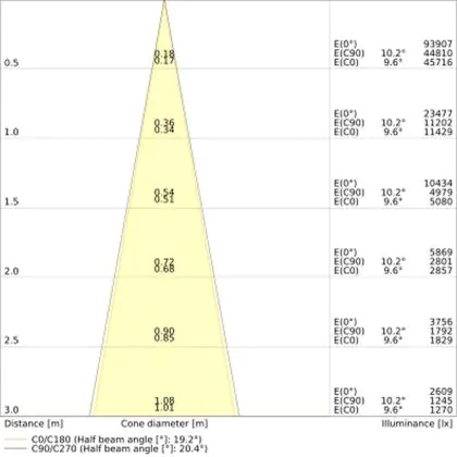 Der Abstrahlwinkel bezeichnet den Winkel, in dem das Licht aus der Lichtquelle ausgestrahlt wird. Er wird in Grad (D) angegeben. Je geringer die Gradzahl des Abstrahlwinkels ist, desto kleiner ist auch der Durchmesser des Lichtkegels, den die Lichtquelle produziert. Beispiel: Wird eine Lampe mit einem Abstrahlwinkel von 60 Grad an der Decke (2,5 m Höhe) angebracht, erzeugt sie einen Lichtkegel von 2,9 Metern Durchmesser. Hat die Lampe hingegen einen Abstrahlwinkel von 120 Grad, beträgt der Lichtkegel 8,7 Meter im Durchmesser. |