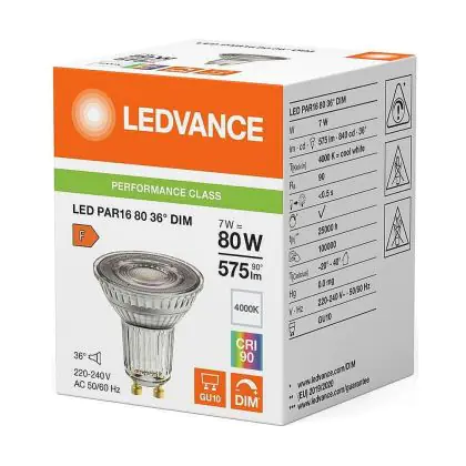 Die Mehrfachpackung 10x Ledvance LED PAR16 GU10 Reflektor 7W 575lm 36D - 940 Kaltweiß | Höchste Farbwiedergabe - Dimmbar - Ersatz Für 80W ist eine effiziente GU10 LED-Lampe und der perfekte Ersatz für Ihre konventionelle Halogenlampe mit 80W und einem GU10-Sockel, bei welchem die zwei Stifte einen Abstand von 10 mm zueinander haben. Zudem strahlt das Produkt Licht in der Farbtemperatur aus und punktet durch eine lange Lebensdauer.